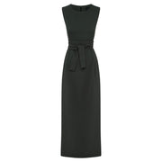 The Delphine dress is a sleeveless slip dress with a removable self-tie waist belt.